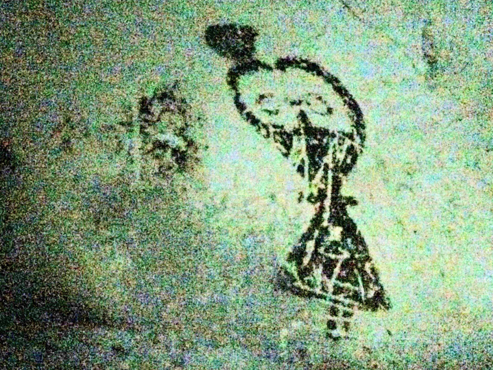 In der oberen Reihe links vom Zentrum steht eine tanzende Frau (?) mit erhobenen Händen, weiter rechts ein Mann mit erigiertem Glied.