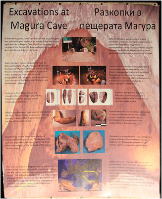 A poster reports on excavations and studies in the cave by an international team from Bulgaria, the US and Germany. They are part of the Balkan Valley project, which has as its main subject the study of when and why migrations of early humans to or from Europe took place. The Balkan Peninsula is one of the possible routes.