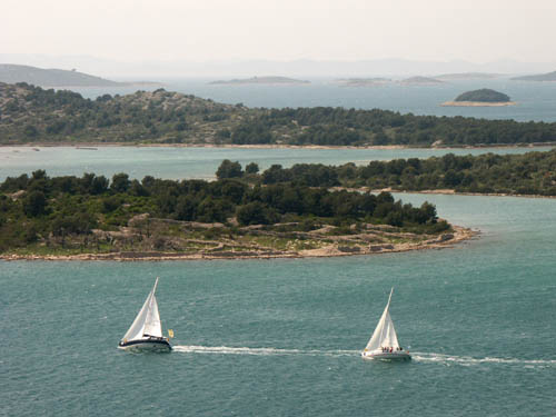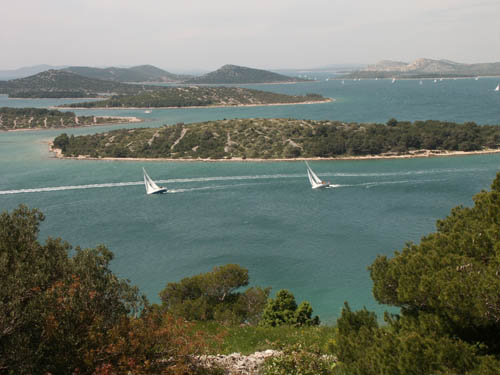 The Kornati area is a paradise for sailors. Looking back to the north-west again from our viewpoint, we are lucky to witness the final stages of a sailing race ending in the channel leading into Murter.