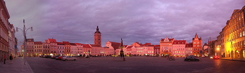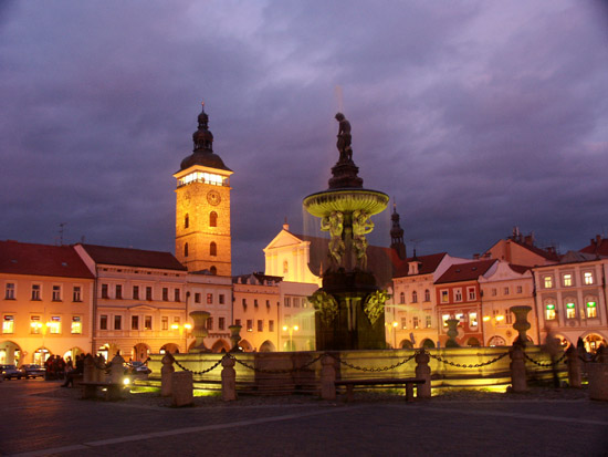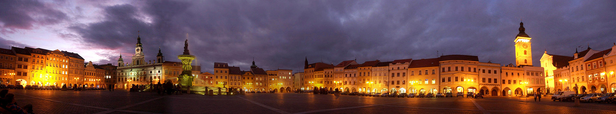 Budweis has been the commercial and cultural centre of South Bohemia for many centuries. The broad urban belt around the old town is modern and characterized by industry. The twilight is coming on as we near the old town centre on our easy walk in from the camping site.