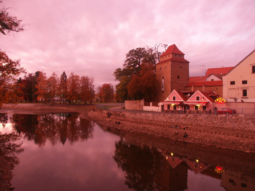Der historische Stadtkern wird reizvoll eingeschlossen von den Flüssen Moldau und Maltsch, die kurz hinter dem alten Wehrturm zusammenfließen und dabei eine schöne Insel und Halbinsel bilden, die ganz dem Sport gewidmet zu scheinen. Dort befindet sich auch ein bekanntes Stadion für Eishockey, eine Sportart, in der Tschechien 2005 Weltmeister gegen Kanada wurde. Der alte Wehrturm, wegen seiner Form auch "Eiseren Jungfrau" genannt, ist Teil der alten, früher uneinnehmbaren Stadtmauer. Heute befindet sich in ihm ein Museum, das u.a. auch eine richtige "Eiserne Jungfrau" ausstellt, nämlich das im Mittelalter bekannteste Folterinstrument (mit Nägeln ausgekleideter Holz- oder Eisenkörper, in dem eine Person eingeschlossen wurde). Auf dem Foto nur schwer zu erkennen: Zu Werbezwecken wurde aus einem Fenster des Turms eine große Fahne mit dem Abbild einer Eisernen Jungfrau gehängt.