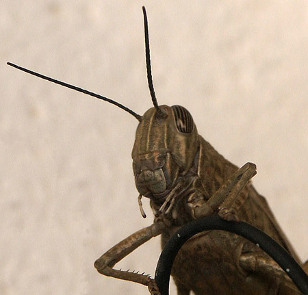 No - not a cave-dweller! On the morning of our departure from Cordoba towards the Granada area we were visited on the campsite by this large grasshopper, which looked as if it was trying for the job of chauffeur. By the way, close-up photography of insects is a good way of getting over aversion to them - as Elli will testify.