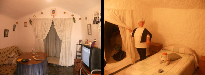 Wir schlendern kamerabewaffnet durch die fremdartigen Gassen von Purullena , da werden wir von einer Frau heftig herbeigewinkt. Sie möchte uns ihre Wohnung von innen zeigen. Wir können unser Glück über so viel Großzügigkeit kaum fassen, bis wir am Ende der Führung feststellen, dass die gleiche Großzügigkeit in Form eines üppigen Trinkgeldes (als John 5 Euro anbietet, schiebt die Frau uns klagend den Kinderwagen mit einem Neugeborenen unter die Nase - John verdoppelt) auch von uns erwartet wird. In der Folge flüchten wir geradezu vor Angeboten, die uns in den Gassen von eifrigen Hausfrauen angetragen werden. Doch dieses eine Mal hat es sich gelohnt: Auch wenn wir Skrupel empfinden, so weit in die Intimsphäre einer Familie einzudringen, drängt die Frau darauf, uns fast jeden Winkel ihrer Wohnung zu zeigen. Anscheinend sind die Höhlenwohnungen nach einem ähnlichen Muster gebaut. Durch die Haustür, die meist nur aus einem Vorhang besteht, tritt man in das gemütliche, noch helle Wohnzimmer, an das sich die Schlafräume anschließen, die ebenfalls nur mit dünnen Vorhängen abgegrenzt werden.