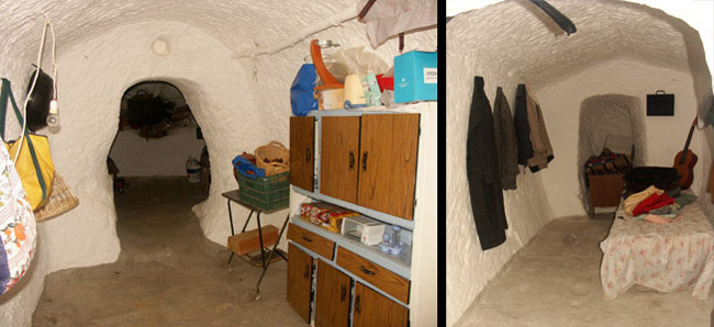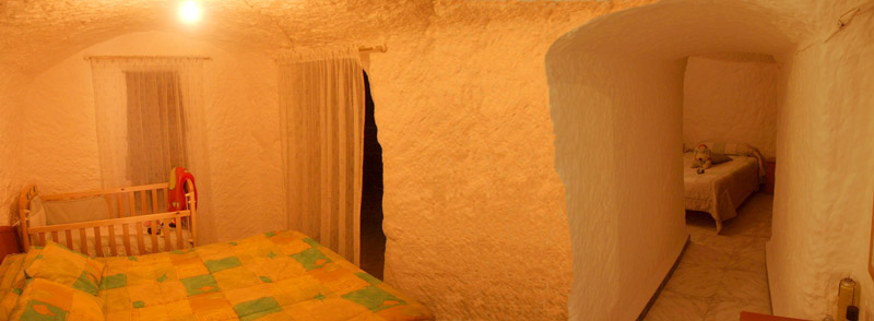 Here is a cave panorama showing white-washed bedrooms. The homes are well-known for their excellent climate - in summer and winter the temperature is about 20°C - and for the insulation from noise. The thickness of the walls prevents sound from travelling out or in - unless of course you have dug too close to the neighbours!