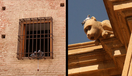 Vergitterte, als Schirmständer missbrauchte Fenster und Klinkerfronten bezeugen die maurische Vergangenheit der Stadt. Der Wasserspeier an der Kathedrale scheint beliebter Aussichtspunkt einer Taube zu sein.
