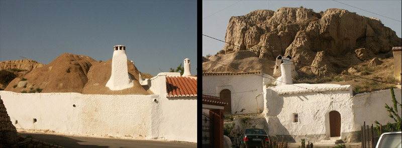 After this problem has been satisfactorily solved, we make a trip to the area of Guadix, which is famous for its cave-dwellings (Cuevas). For at least 2000 years people have been digging caves into the soft but waterproof tuff rock composed of volcanic dust, in the so-called badlands, agriculturally useless ochre hills. Behind undecorated entrance walls the dwellings open out into passages and rooms. Their presence is indicated on the outside by chimneys and aerials sticking up from the hills and slopes. The picture shows part of the small town of Purullena.