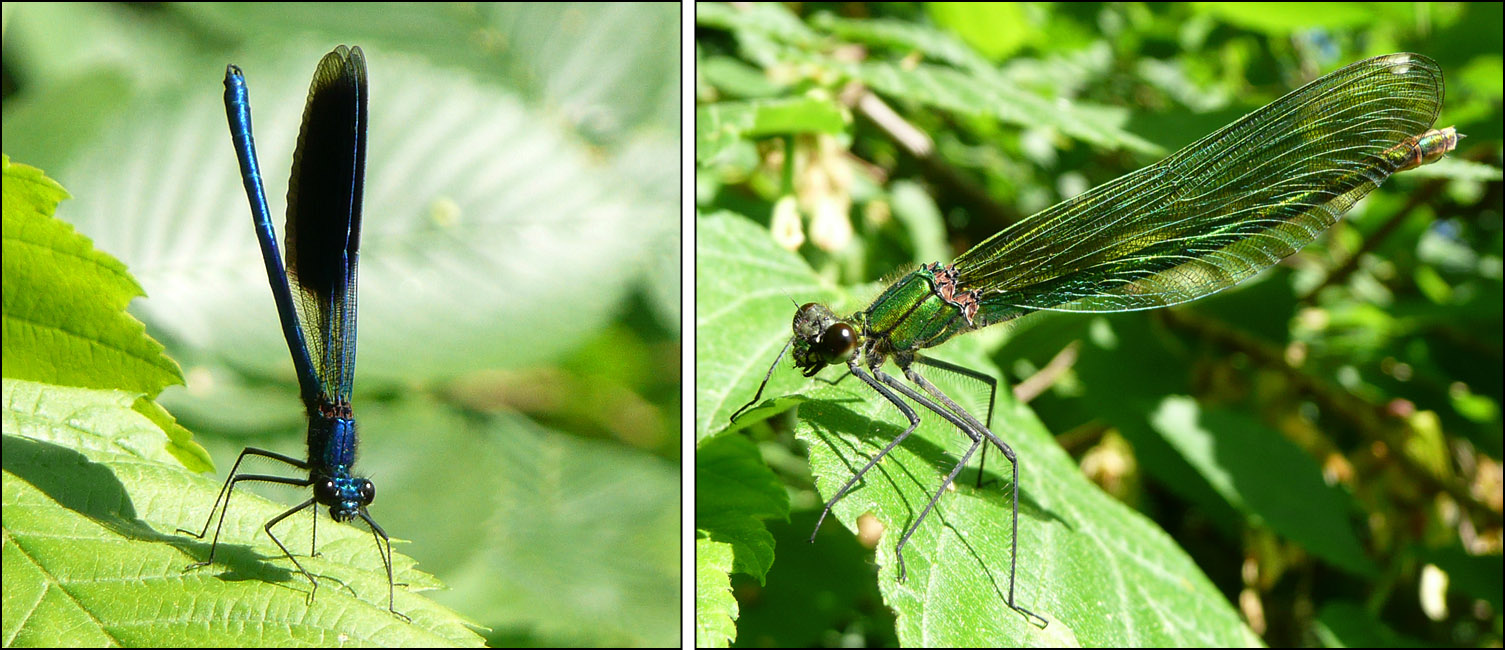 But down at the river this has given nature a chance to expand. Innumerable frogs jump up as we approach the river shore and in the air metallic shining dragonflies are fluttering around in numbers we havent seen before. Some of them land very close to us. A female Banded Demoiselle poses unhurriedly for us (r), while more luck is needed to get the shyer, iridescent blue male of the species (l) in front of the lens.