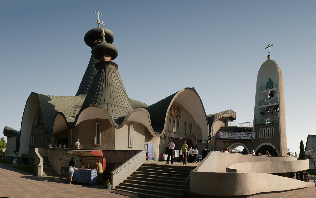 Wir befinden uns bereits am Rande des Nationalparks, als wir im Städtchen Hajnowka diese verblüffend futuristische Kirche entdecken. In Bezug auf die Gestaltung eines neuen Kirchenbaus scheint eine riesige Freizügigkeit zu herrschen. Aus Lautsprechern im Hof dringen wunderschöne Chorgesänge zu uns.