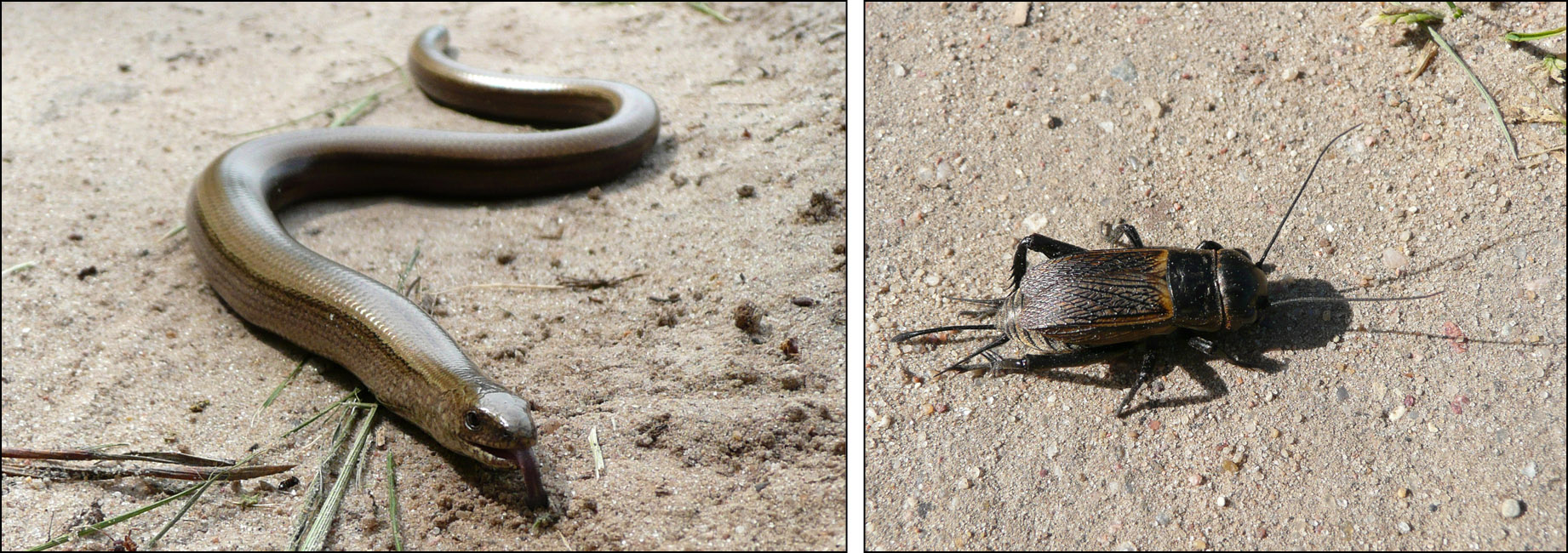 We are rather more successful at spotting smaller animals. On the sandy ground a good-sized slowworm slithers towards us (l) and a magnificent cricket dozes in the sun in the middle of the path (r).