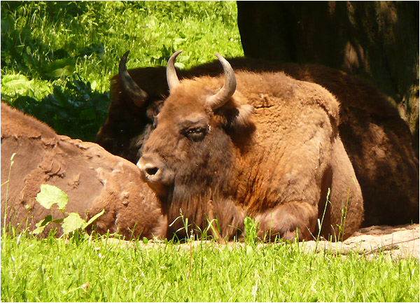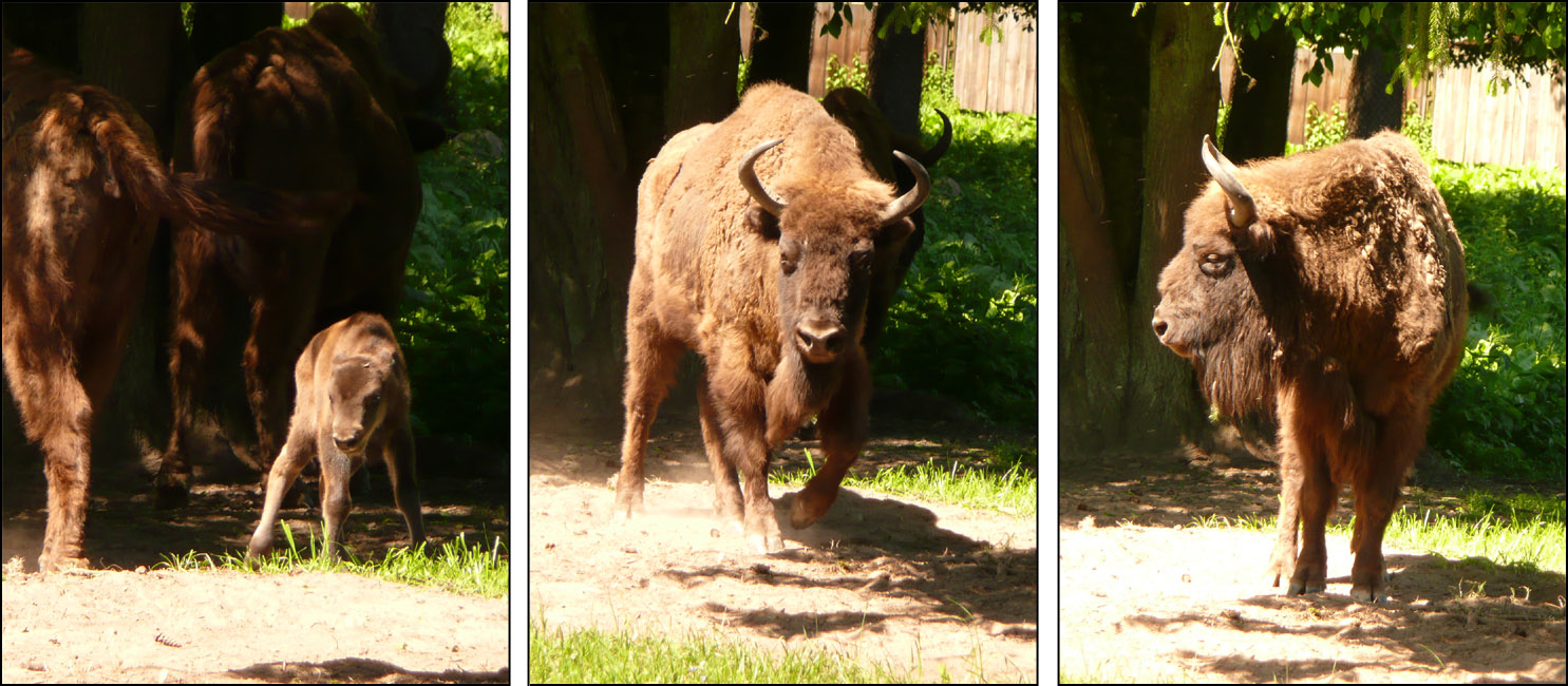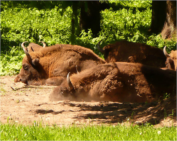 Die Wisente suhlen sich im staubigen Boden und lassen sich von uns nicht stören. Schließlich stehen wir hinter einem mannshohen Zaun. Die Tiergruppe befindet sich nämlich im Tierpark des Nationalparks.