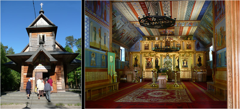 On the highest point of the Holy Hill of Grabarka stands a Russian-Orthodox Church, the most important sanctuary of it kind in Poland (l). The inside of this unusual church reminds us with the striped patterns on the ceiling of the painted interiors of the Wooden Churches in Little Poland. At the front of the church is an Orthodox iconostasis.