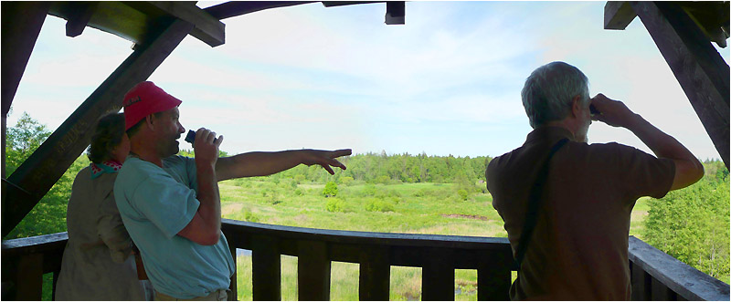 Anhand einer guten Karte, die es am Campingplatz zu kaufen gibt, haben wir - nach einer moskitoverseuchten Wanderung durch tiefer liegende Waldgebiete - den Turm erreicht und steigen schweigend hinauf, um potentielle Wildtiere (Luchs, Wolf, Rothirsch, Reh, Wisent) nicht zu verscheuchen.