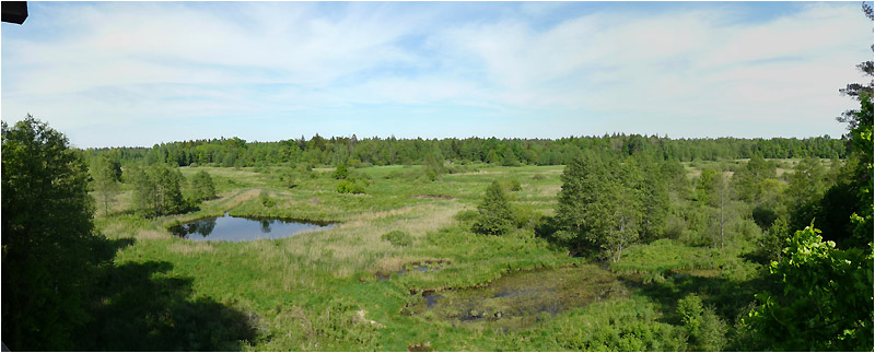 Based on a good map which was on sale at the camping site and after a mosquito-pestered walk through the low-lying areas of the wood, we reach the tower and climb up silently, so as not to scare away all the wild animals (lynxes, wolves, red deer, roe deer and bison) we hope to see.