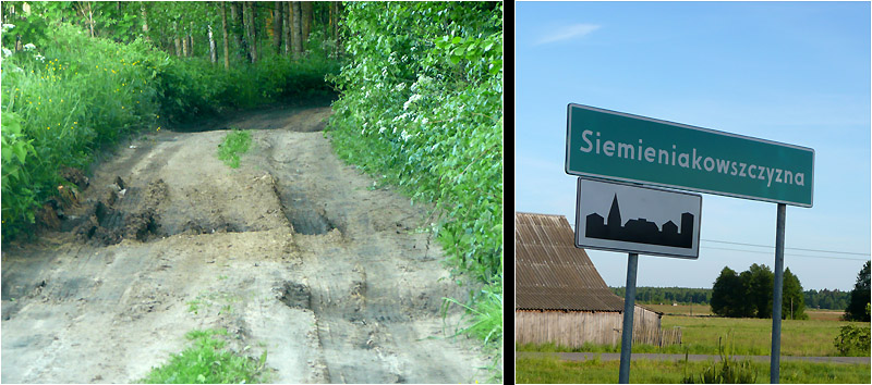 Was auf der Karte als Straße gewertet wird, wird von uns befahren, auch wenn unser VW-Bus - und wir - bald an unsere Grenzen stoßen und wir wenig später höchst abenteuerlich in einem Acker wenden müssen (li). Zum Gefühl, am Ende der Welt angelangt zu sein (wir sind der weißrussischen Grenze sehr nahe), passt auch der unaussprechliche Name eines kleinen Grenzdorfes: Siemieniakowszczyzna.