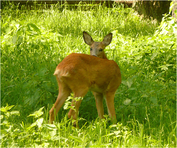 Rehe erwecken selten den Anschein von Trägheit, immer sind sie achtsam und fluchtbereit, so auch dieses hübsche Tier in einem der Wildgehege.