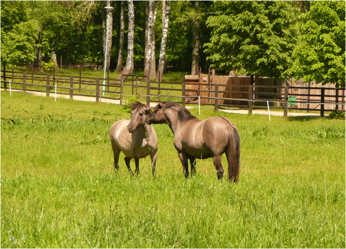 Früher lebte eine diesen Pferden ähnliche Rasse in Polen, man nannte sie Tarpane. Nach ihrer Ausrottung versuchte man, sie rückzuzüchten. Die Gruppe, die sich hier im Tierpark befindet, scheint mit permanenten Machtkämpfen beschäftigt zu sein.