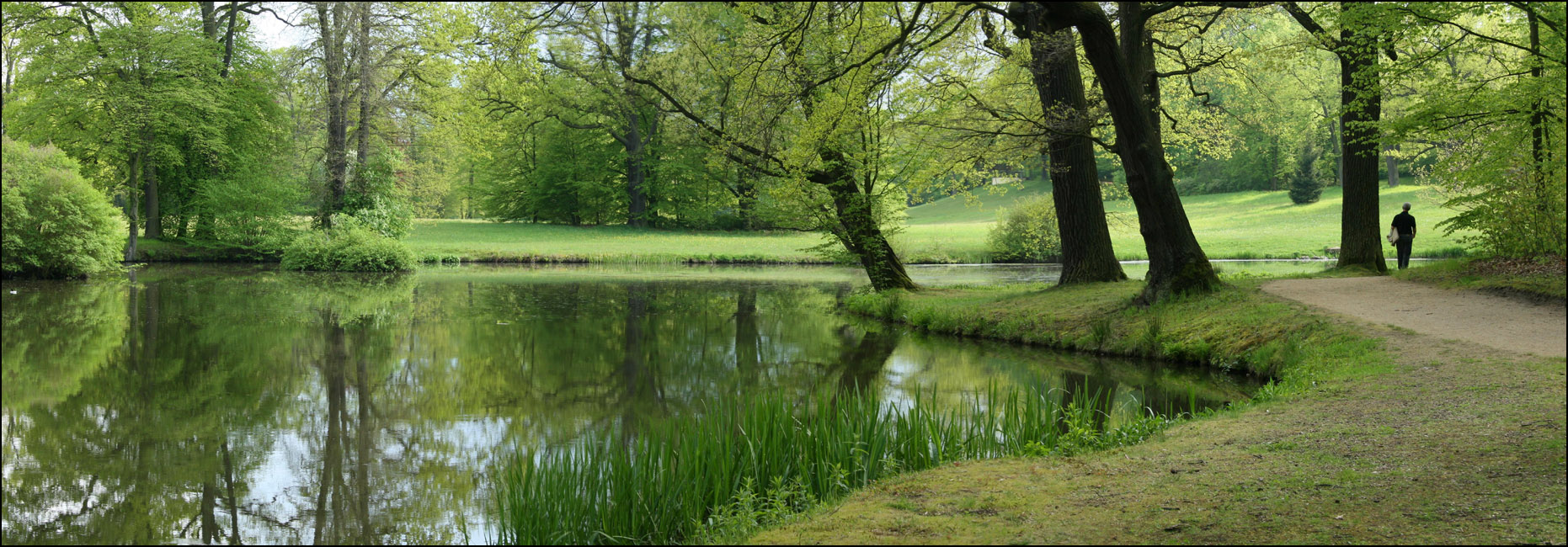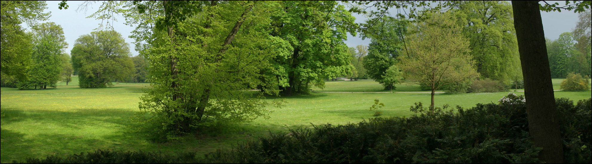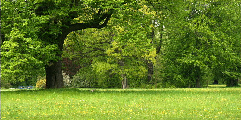 Alte Eiche am Wiesenrand, links im Hintergrund die Fuchsienbrücke