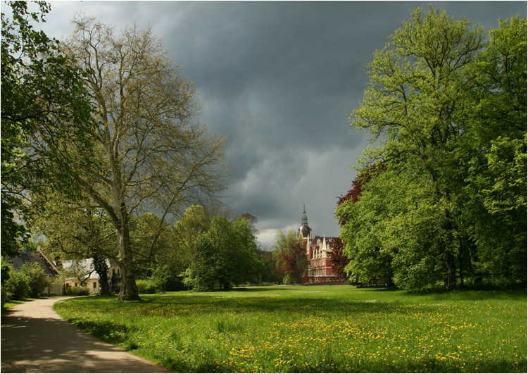Schwere Wolken über dem Neuen Schloss (re) und dem Vorwerk (li)
