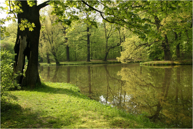 An old oak on the edge of the meadow. In the background on the left is the Fuchsia Bridge.