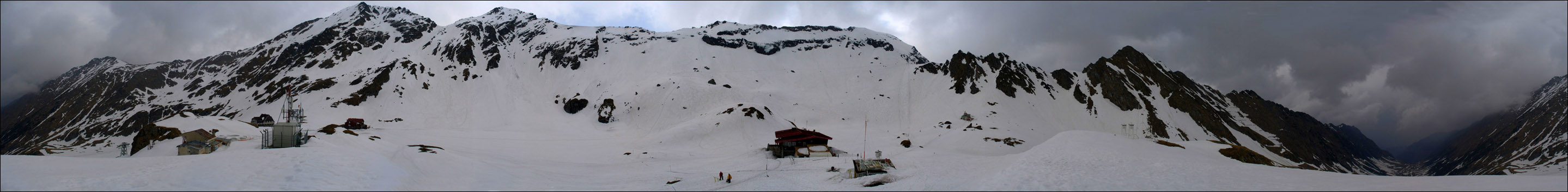 Dies ist ein 360 Grad Panorama, bestehend aus 11 Bildern. Links sieht man die Bergstation der Gondelbahn, daneben eine Wetterstation und eine Berghütte. Zwischen dieser Hütte und dem Gebäude in der Bildmitte liegt, noch völlig zugefroren, der Gletschersee. Ganz rechts (aber auch ganz links, da die Ansicht ja 360 Grad beträgt) blickt man ins steil abfallende Tal des Baleabachs hinunter, an dessen Ende sich Carta und das Olt-Tal befinden (wahrscheinlich noch immer im Sonnenschein).