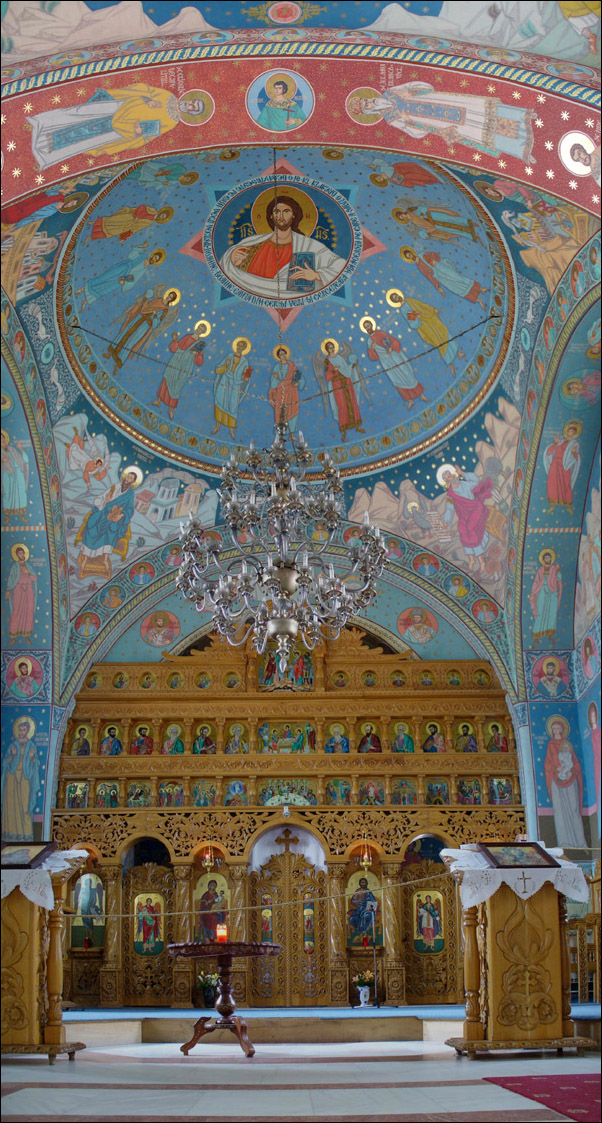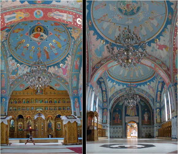 Zwei Vertikalpanoramas (jeweils zwei Bilder), die auch einen Blick in die drei Kuppeln ermöglichen. Das Kloster ist übrigens berühmt für seine Ikonenwerkstatt (und für sein Ikonenmuseum). Die Ikonen entstehen hier in aufwändiger Hinterglasmalerei und gehen in die ganze Welt. Auch die Ikonen an der Altarwand (links) sind wohl in dieser Technik gemalt. Vielleicht erkennt man dies, wenn man das Bild vergrößert.