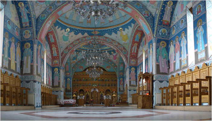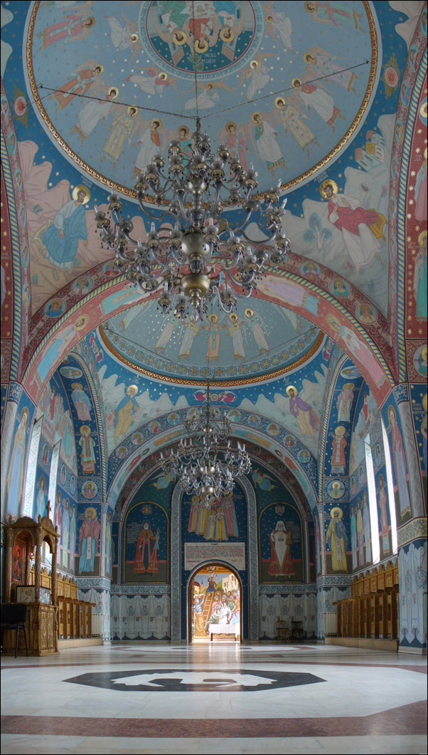 Eine neue, komplett fertiggestellte Kirchenhalle öffnet sich vor uns. Wir entdecken einige Merkmale, die uns aus anderen orthodoxen Kirchen bereits vertraut sind: die langen Stuhlreihen entlang der Wände für die Alten und Kranken (ansonsten stehen die Kirchenbesucher ja), die Ikonostase am Kopfende, hinter der sich das Mysterium verbirgt und die Ausmalung von jedem Zentimeter der Wände und Decken. Nur sehen die Räume sonst wesentlich dunkler aus, was vielleicht daran liegen mag, dass Weihrauch und zahlreiche brennende Kerzen die Farbschichten im Laufe der Jahre verdunkeln.