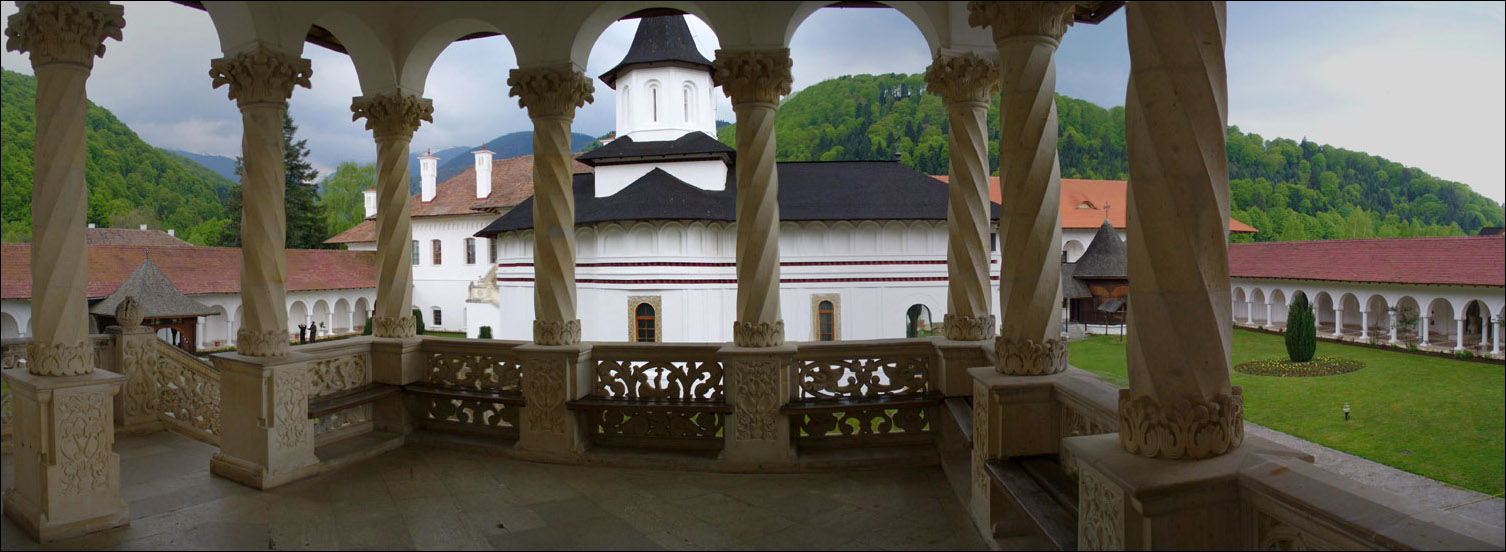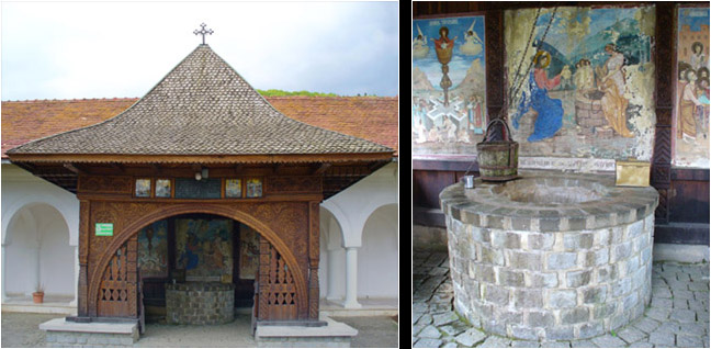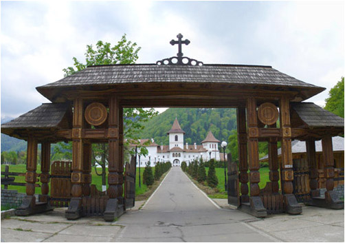 Inmitten der rundlichen, buchenbewachsenen Hügel liegt das Kloster. In diesem Moment wissen wir noch nicht, dass es neu ist. In keinem anderen von uns bisher bereisten Land haben wir so viele Neubauten von Kirchen und Klöstern entdeckt. Da die Rumänen es vortrefflich verstehen, baulich und künstlerisch an die alten orthodoxen Traditionen anzuknüpfen, können Laien wie wir den Unterschied zwischen alt und neu häufig nur schwer erkennen. Auch der Eingang zum Kloster wurde traditionell, in der Kunst meisterlicher Holzbearbeitung, als prächtig geschnitztes Tor gestaltet.