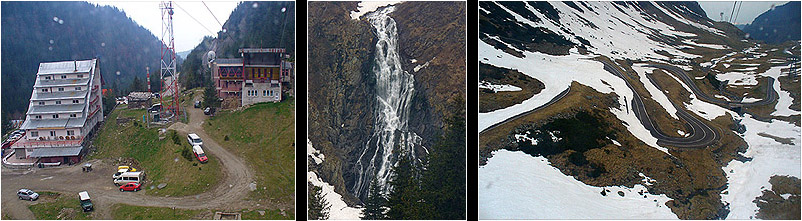 The road climbs up quickly through the Balea Valley nature reserve to the cable-car station at the memorable altitude of 1234m (left). This is near the foot of the Balea Waterfall (centre), which is fed by the run-off from the largest glacier lake of the Carpathians, the Balea Lake at 2034m. This lake is what we are aiming to reach. A road (incidentally another one of Ceausescus prestige projects), is shown on our map leading up to the lake, and we hope to be able to drive up to it. It is soon obvious that it is still much too early in the year (early May) for this. Much of the long serpentine road is still covered by snowdrifts, so we go up in the cable-car instead. (Cant remember the price, but after experiencing cable-car prices in Switzerland we found it inexpensive!)