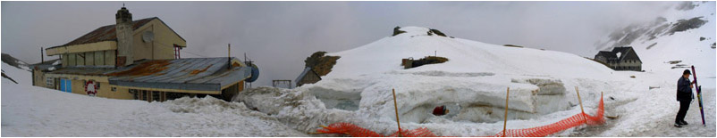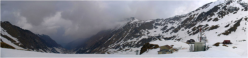 This rather dark picture is a 360° panorama (can be expanded) made up of 11 pictures. On the left is the top station of the cable-car. Between the buildings on the left and the dark restaurant building in the middle is the glacial lake, still completely frozen and snow-covered. On the far right (and also on the far left) is the steeply falling valley of the Balea River, at the end of which are Carta and the Olt Valley, (which are still probably enjoying sunshine).