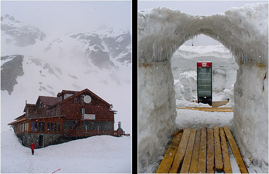 Es beginnt zu schneien, und wir suchen den Schutz einer Berghütte auf. Die Cabana Balea-Lac ist ganz in deutscher Hand und bietet einen Drei-Sterne-Service an. Sie liegt auf einer Landzunge mitten im Gletschersee. Um die Wende herum brannte sie ab, wurde aber im Jahr 2000 wiederaufgebaut. Sie ist eine der meistbesuchten Berghütten der Karpaten, da - von den guten Skimöglichkeiten während des Winters abgesehen - von hier aus im Sommer prächtige Kammwanderungen unternommen werden können.