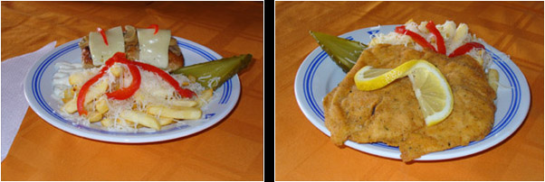 After waiting a while in the Cabana and not getting served, (to be fair, there was a lot going on and too few people serving), we go to the other restaurant for a meal. We want to eat something Romanian, but when delivered it is mostly the decoration that is unusual. Grated cheese on the potato chips, soured cream, pickled cucumber (Romania is cucumber country!), escalope of pork and an enthusiastic cook who is pleased when we photograph her food. It tasted good as well.