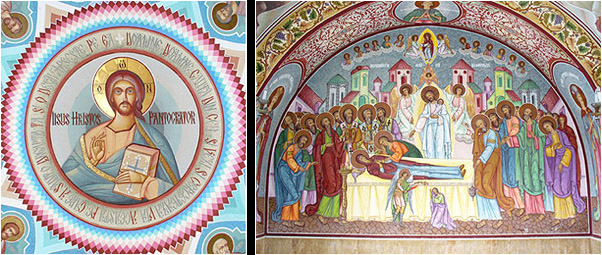 Was man nur ausmalen kann, wird ausgemalt. Von der Kuppe unter dem eigentlichen Klostereingang blickt Christus Pantokrator, der Allherrscher, auf den Eintretenden herab. Die Szene rechts stellt wohl Maria Heimgang dar, ein Fest, das bei den orthodoxen Rumänen allerhöchstes Ansehen genießt und hier in Sambata am 15. August mit mehrstündigen Feiern und zehntausenden Pilgern gefeiert wird.