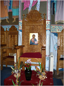 A richly carved throne stands here as well, with fresh flowers in front of it. The throne is presumably dedicated to Christ Almighty.