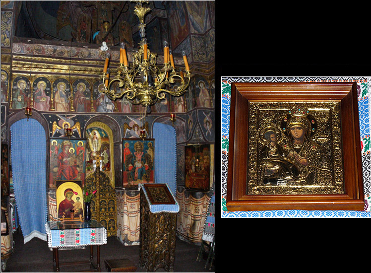The dark, relatively narrow rooms of the monastery church remind us of other typical orthodox churches. The innumerable pictures of the saints and of biblical scenes, named eyes to heaven, are darkened with age, and the atmosphere in here seems very mystic. The icons on the walls are presumably done in back-painted glass. The icon of Mary and Child on the lectern is highly revered in the orthodox church.