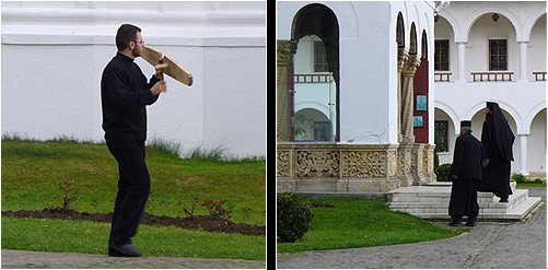 In the courtyard the rapid, dull thumping sound of hammering on a wooden beam can be heard. A monk is summoning to prayer and a few monks follow the summons. When Transylvania was under Ottoman rule in the Middle Ages, the Moslems forbade the ringing of church bells. The substitute from those times lives on in tradition today.
