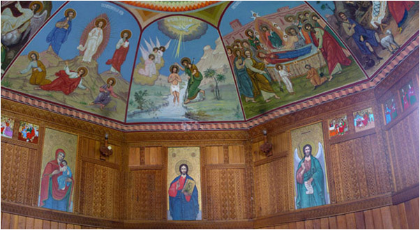 There seem to be paintings everywhere. From the roof of the entranceway an icon of Christ Pantokrator (Lord of Everything) looks down at us. The scene in the right-hand picture shows the death scene of Mary. The feast in memory of that event is among the most important in the Orthodox calendar. On 15th August here at Sambata the feast is celebrated for many hours and is attended by thousands of pilgrims.