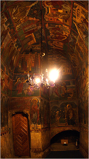 The churches consist usually of 5 rooms: anteroom, burial chamber with a treasure chamber above it, the naos (room for the congregation) and the sanctuary (reserved for the priests and deacons) beyond the iconostasis, (the icon-covered screen). Here we look through from the burial chamber to the naos with the icon screen.
