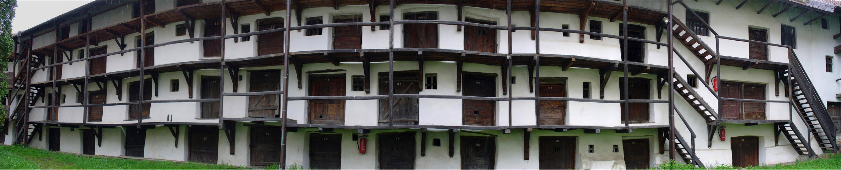 Die einzelnen Kammern sind über Holztreppen und Balkone erreichbar. Die Stufen sind so steil, dass man sich eher auf einer Leiter wähnt. Da die Burg im Laufe ihrer Geschichte mehrfach niedergebrannt ist, hängen heute an vielen Stellen Löschgeräte.