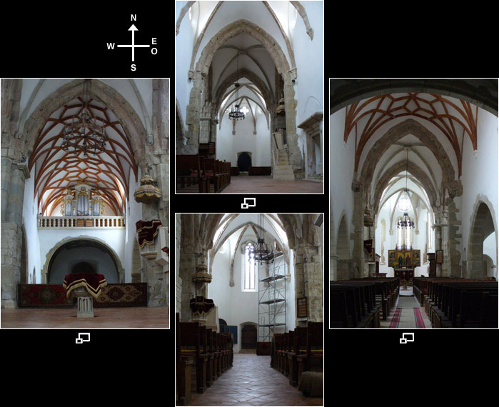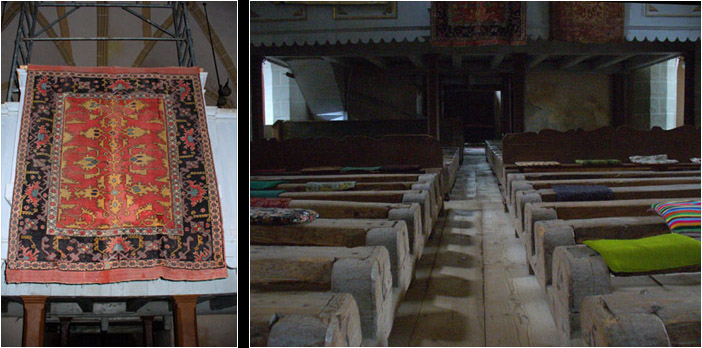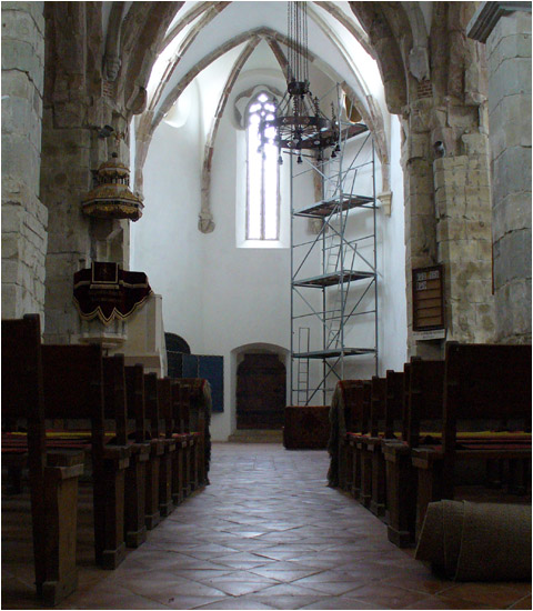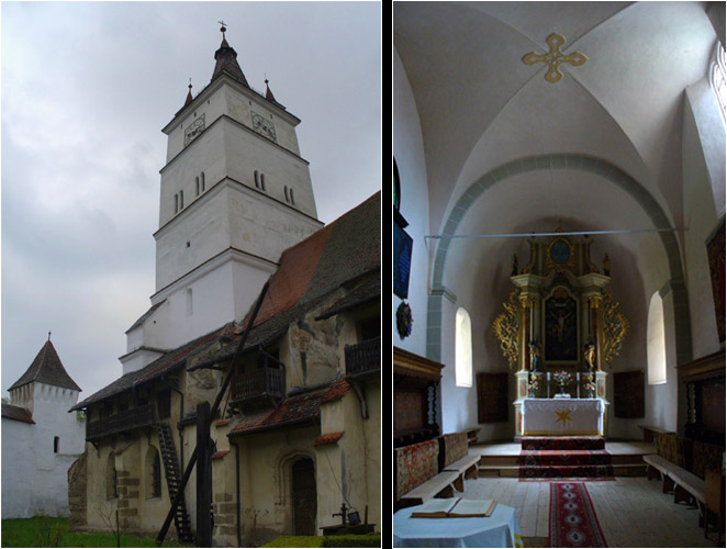 As in many churches in Transylvania there are many oriental carpets hanging in the church, which were donated by traders who dealt with the Tartars. Remarkable also are the archaic-looking pews in the body of the church, which were installed after a fire in 1595. The pews have no back-rests, so that the decorated ribbons on the backs of the womens traditional costumes would not be damaged. Sunday services still take place here, although the congregation is now much smaller.
