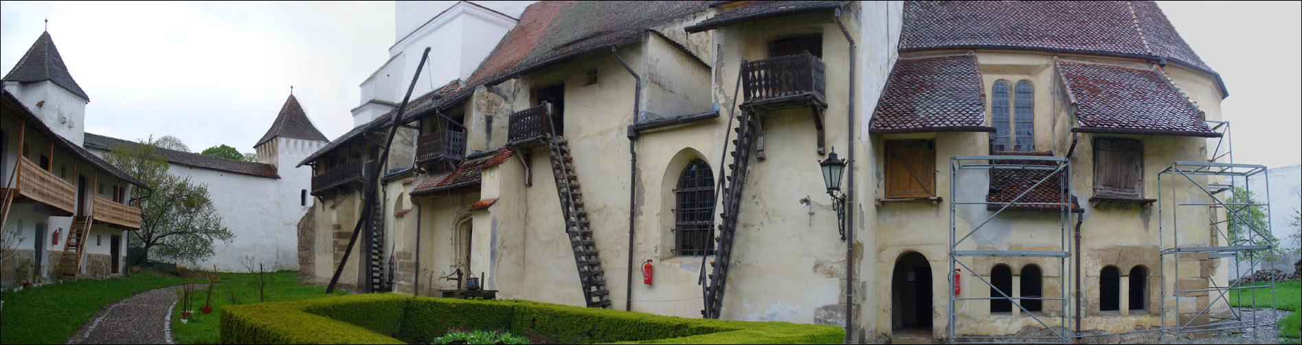 In this picture we see again the chambers built onto the sides of the church. In times of emergency they and the courtyard area were full of people and animals. Very steep steps for the old or for women with large skirts! Space on the inner defensive wall is only partially filled with storage rooms. These and the ones on the church walls are clearly being renovated. Maybe in future years such castles will be used for adventure vacations!