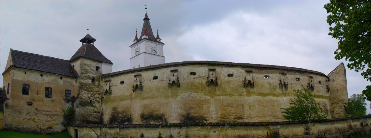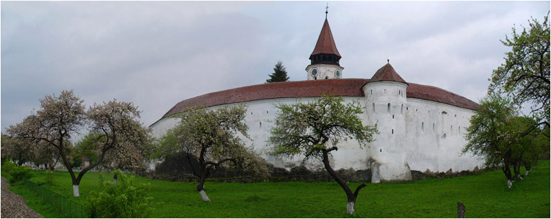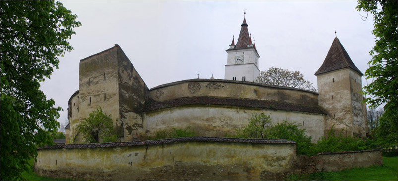 Und das ist die Ansicht des alten Gebäudes. Wieder ein historisches Sahnestückchen ersten Ranges. Die Kirche wurde zwischen 1280 und 1300 erbaut. Fast kreisrund umgeben sie drei Mauern mit einem Umfang von 430m, somit ist auch sie eine der größten Anlagen in Siebenbürgen. Der innere Bering ist 12m hoch und an der Basis 4m stark. Sieben viergeschossige Türme flankieren die Mauer (links der einzige Turm mit Pultdach, in dem sich eine Kapelle aus dem 15.Jh. befindet, die mit wertvollsten Fresken ausgemalt ist).
