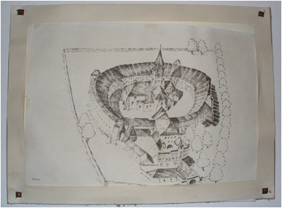 Man muss diese Anlage unbedingt von oben gesehen haben. Da wir jedoch nicht mit Luftaufnahmen dienen können, muss diese Zeichnung, die im Museum der Kirchenburg hängt, als Übersicht genügen. Die zentrale Kirche, die ursprünglich die Form eines griechischen Kreuzes (vier gleichlange Kreuzarme) besaß, wurde wohl vom Ritterorden nach dem Vorbild der Kreuzkirche in Jerusalem errichtet. Erst ab 1512 wurde das Längsschiff verlängert. Die Wehranlage stammt ebenfalls aus dem 13.Jh. Sie wurde im Lauf der Jahrhunderte immer wieder verstärkt und erhielt die heutige Form mit einer Vorburg im Süden im 16./17.Jh. An den inneren Bering wurden vierstöckig Wohn- und Früchtekammern angelegt, (sehen Sie dazu das Bild ganz oben auf dieser Seite), und die derart aufgeblähte Mauer wurde komplett überdacht.