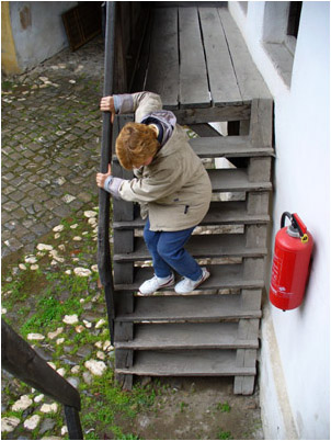 We have come in through the entrance, built in the 18th century in place of the previous draw-bridge, and are in the first court. This court is also surrounded by rooms on several stories. The yellow building on the right was used as town hall, today it is a museum. There a Translvanian Saxon lady greets us in a friendly way and gives us lots of information. We ask if the recognition of the castle as UNESCO World Heritage has helped. Her answer is only partially positive. The officials involve themselves in every building project, but often have no idea of local conditions. So for new roofing they dictated a particular mixture for the tiles, although people in the area knew that these tiles would not last in local weather conditions. On entering we have noticed new but already crumbling tiles above the covered stairway. Another greater risk to the castle that she sees is one which apparently nothing is being done about. The ground water level in the area is rising continually. She showed us the entrance to an underground passage (behind the fence in the middle of the picture). The water in it is visibly almost up to ground-level and the passage hasnt been useable for some time now.