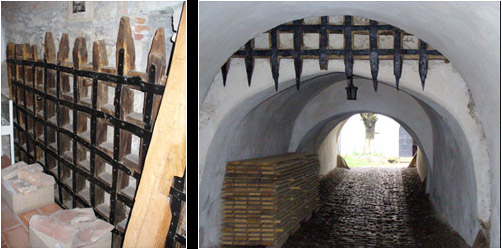The fortified church at Prejmer is the largest and furthest east of these Transylvanian fortifications and was thus especially exposed to the attacks by Mongols, Tartars, Turks, Cossacks, Moldavians and others. Prejmer was damaged and rebuilt 50 times, but apparently actually taken only once. A heavy portcullis, (left the top of it as seen in the museum, right the lower part), was part of the defences in the passage through to the inner court.