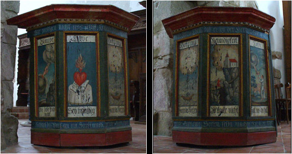 The pulpit decorated in blue and red colours and with Primitive/Baroque paintings remind again of the church at Carta. Faith, Love, Hope, Perseverance and their rewards are shown on the individual panels.
