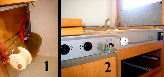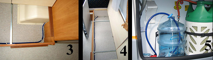 Picture 5 shows the - cannister ;o) What it dosn't show is that around the hose i have sealed the hole with this black goo, that is used for sealing caravans. And that the wire is sealed by a marine-store thing that is ment for selaing wires routed thrugh the deck, e.g. It's something like a large washer with a threaded collar - on the thread you have a "finger-nut" and inside is a rubber ring. You thread the wire through, tighten the nut at thus compresses the rubber ring tight around the wire. And as you (at least here) are not allowed to have any electrical installations in the same compartment as the gas cannister i found it worthwile to make sure that no gas can leak into the living compartment. Our law about gas installations does however allow a water pump in the gas compartment as the pump is a spark proof thing - and placing the wire connection between the wire mounted on the pump and the wire from the tap inside the caravan and using this marine thing allows me to change the water pump without having to take the whole caravan apart.