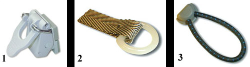 See FixOn photo 1 - the groove on top is for locking on to this plastic strip "thing" while the hook on the roof-pole fits in the hole in the front of the FixOn. This plastic "thing" is actually a small version the rear edge of the tent; the strip that you put in the awning channel of your caravan. With these 3 roof-poles on top of the vertical front poles we just needed to add to vertical poles between the 3 front poles - I hope the other attatched photo makes more sence than me trying to put words on this rather simple idea of mine ;o) Having brought out the old sewing-machine I stitched up the blue "porch front" from a left-over piece of suitable fabric - oh - and please note the little "things" on the inside right of the "sonnensegel" - down by the ground. This is another Isabella thing, that I adapted. It is a plastic ring with tab (see photo 2) in which the IsaFlex (photo 3) fits. Thus sewn on approx 10 cm from the end of the "sonnensegel" I have an inside row of elastic bands to adjust the tension of the sidewalls with. On the edge of the "sonnensegel" we have rings for outside pegs.
